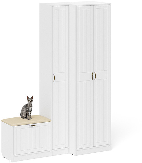 Наименование производителя | Прихожая П-6 Компоновка № 25, цвет белая шагрень/фасады МДФ белое дерево фрезеровка прованс, ШхГхВ 150х50х210 см., универсальная сборка |